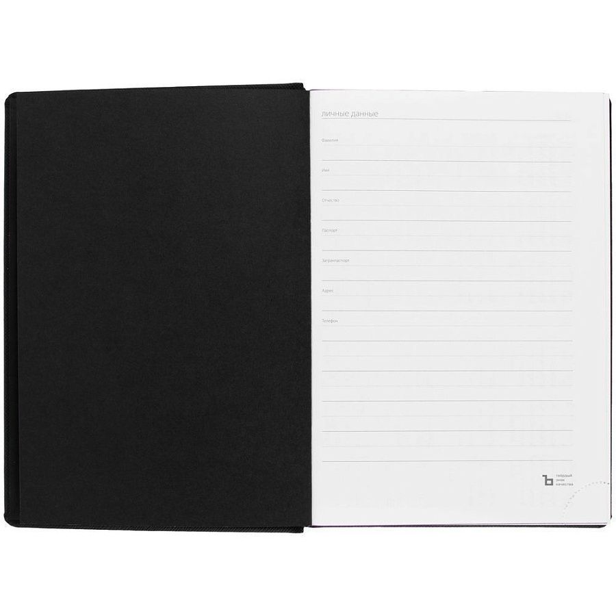 Твердая обложка выполнена из материалов Nice Touch, черный АА, и Canyon, фиолетовый UU. Ежедневник дополнен капталом, резинкой для ручки и ляссе черного цвета.