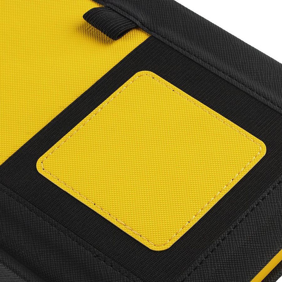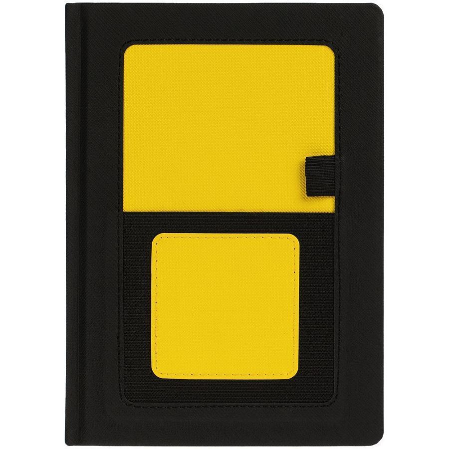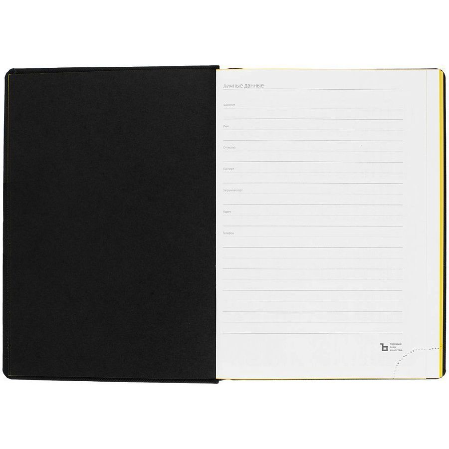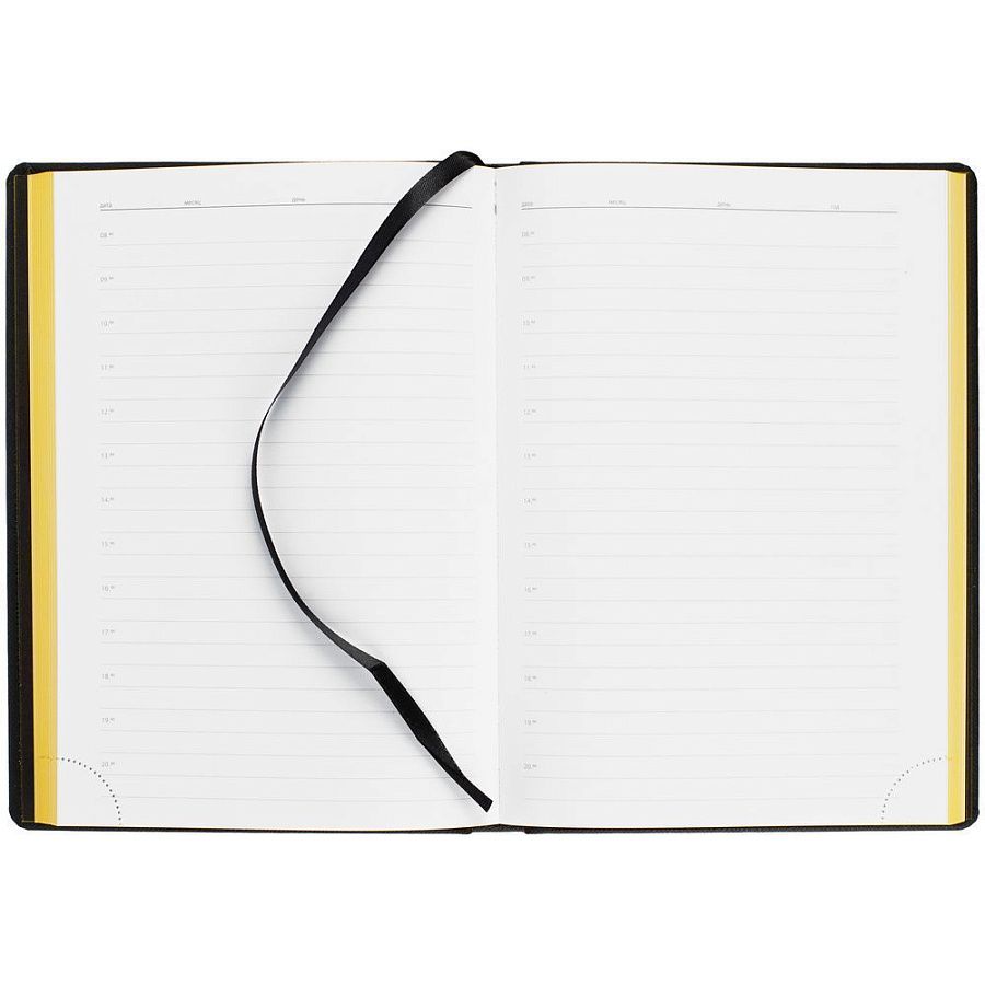 Твердая обложка выполнена из материалов Nice Touch, черный АА, и Canyon, желтый КК. Ежедневник дополнен капталом, резинкой для ручки и ляссе черного цвета.