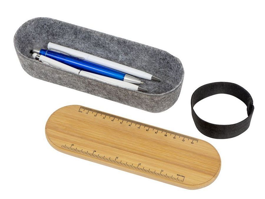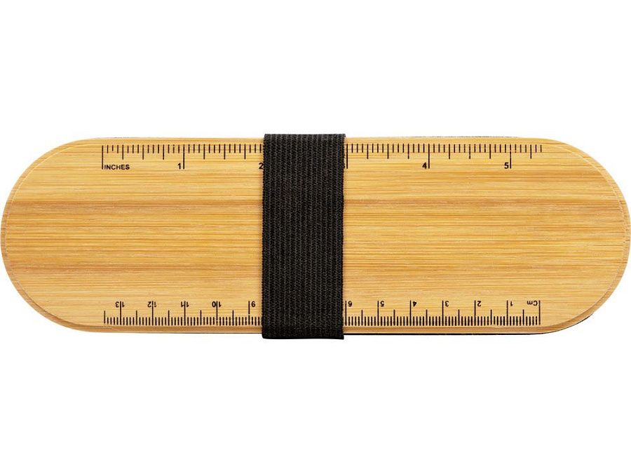 Пенал для ручек и карандашей с бамбуковой крышкой. На крышке есть линейка с несколькими метрическими системами, с оборотной стороны крышки находится выемка, которая может служить подставкой для телефона.