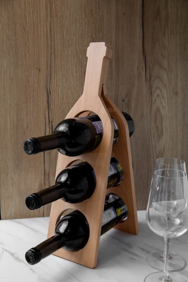 Подставка под винные бутылки, в форме бутылки, предназначен для хранения 3-ёх цилиндрических бутылок, выполнен из премиум материала бук. Материал отличается следующими преимуществами: