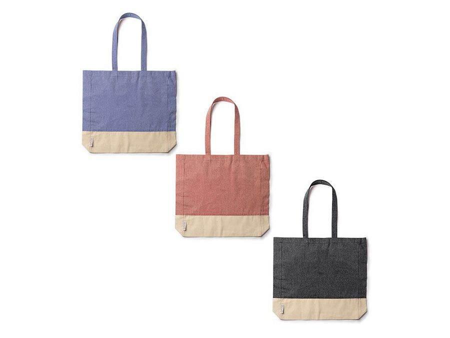 Сумка из переработанного хлопка с отделкой из натурального хлопка плотностью 120 г/м² с донной вставкой. Усиленные ручки длиной 70 см.