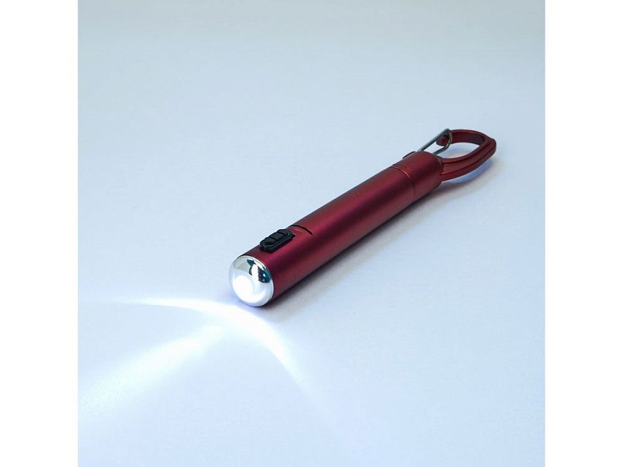 Ручка со светодиодным фонариком, доступна в различных цветах с металлическим покрытием и черной кнопкой. Встроенный карабин. Синие чернила