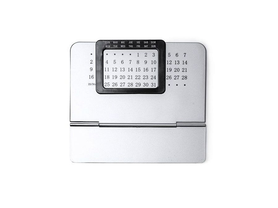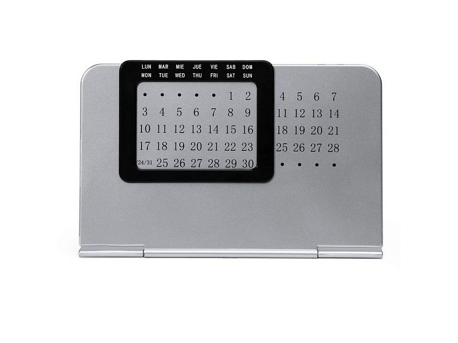 "Вечный" настольный календарь, состоящий из двух частей: одной серебряной подставки с числовой панелью и черной выдвижной рамки с днями недели на испанском и английском языках.