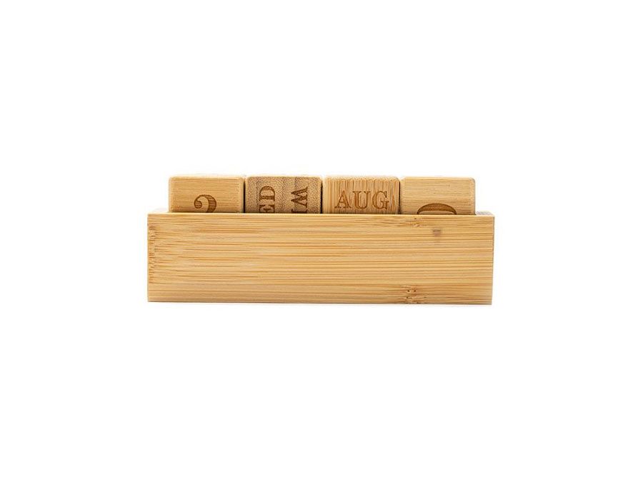 "Вечный" настольный календарь из бамбука, состоящий из одной подставки и четырех блоков с гравировкой.