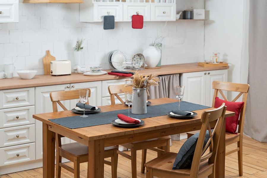 Износостойкая ткань, имитирующая лен, обработана пропиткой от грязи и воды, что делает ее применение для кухни и дома практичным, а уход — легким.