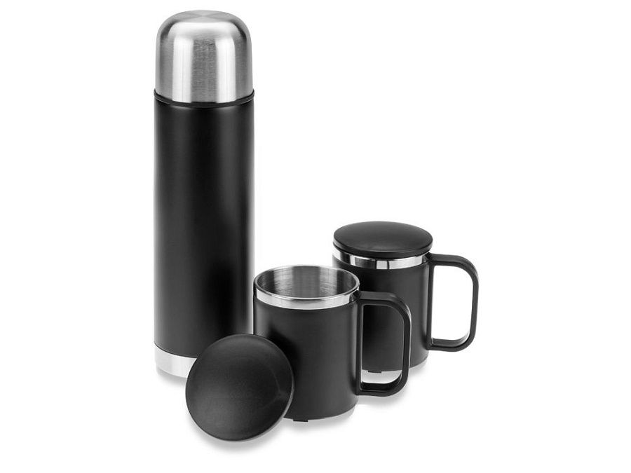 Термос на 500 мл и две термокружки на 200 мл из нержавеющей стали сверху декорированы пластиком, который не даст вашим рукам обжечься. Термос сохранит ваши напитки горячими более 6 часов. Термокружки держат тепло до 2 часов. На термос и кружки можно нанести логотип.