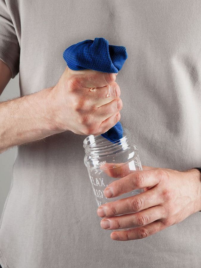 При хранении в бутылке полотенце сохранит охлаждающий эффект в течение нескольких часов. Благодаря крышке-карабину ее удобно прицепить на рюкзак или сумку.
