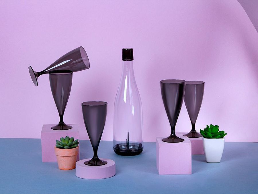 Бокалы упакованы в пластиковую бутылку со съёмным дном, которую удобно брать с собой на пикники.
