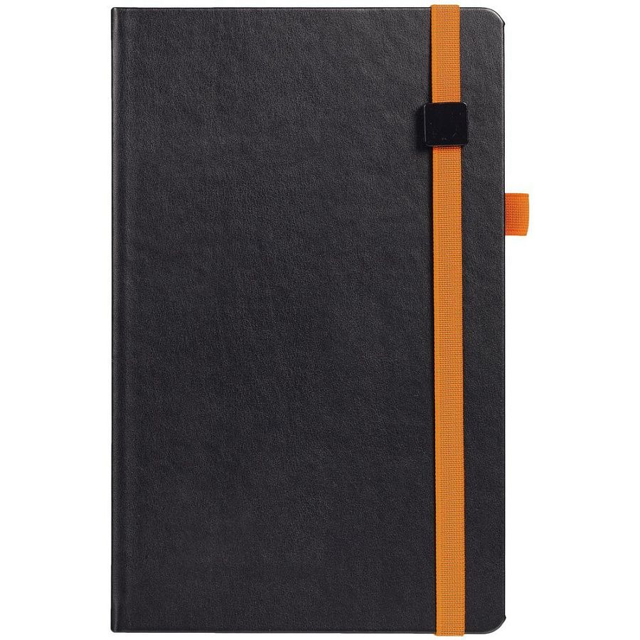 Ежедневник с твердой обложкой, выполнен из материала Waltz, черный АА, дополнен оранжевой резинкой с металлическим шильдом и ляссе.