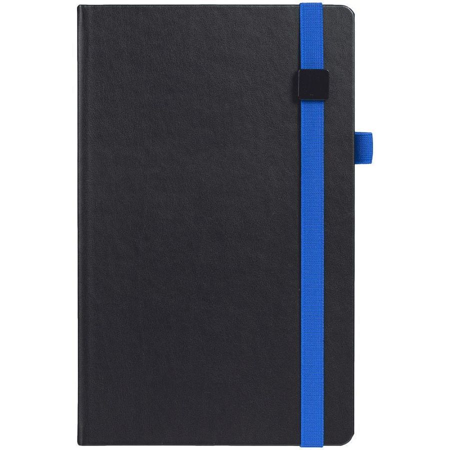 Ежедневник с твердой обложкой, выполнен из материала Waltz, черный АА, дополнен синей резинкой с металлическим шильдом и ляссе.