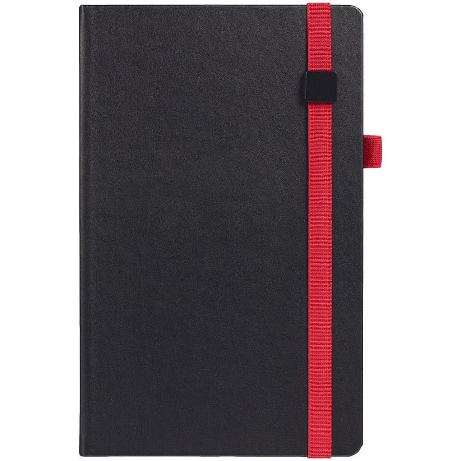 Ежедневник с твердой обложкой, выполнен из материала Waltz, черный АА, дополнен красной резинкой с металлическим шильдом и ляссе.