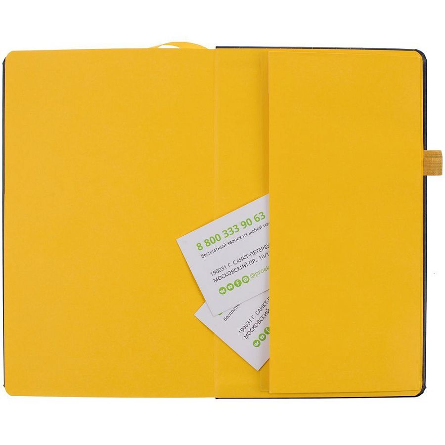 Ежедневник с твердой обложкой, выполнен из материала Waltz, черный АА, дополнен желтой резинкой с металлическим шильдом и ляссе.