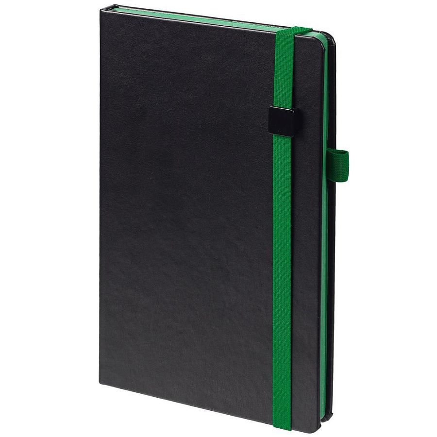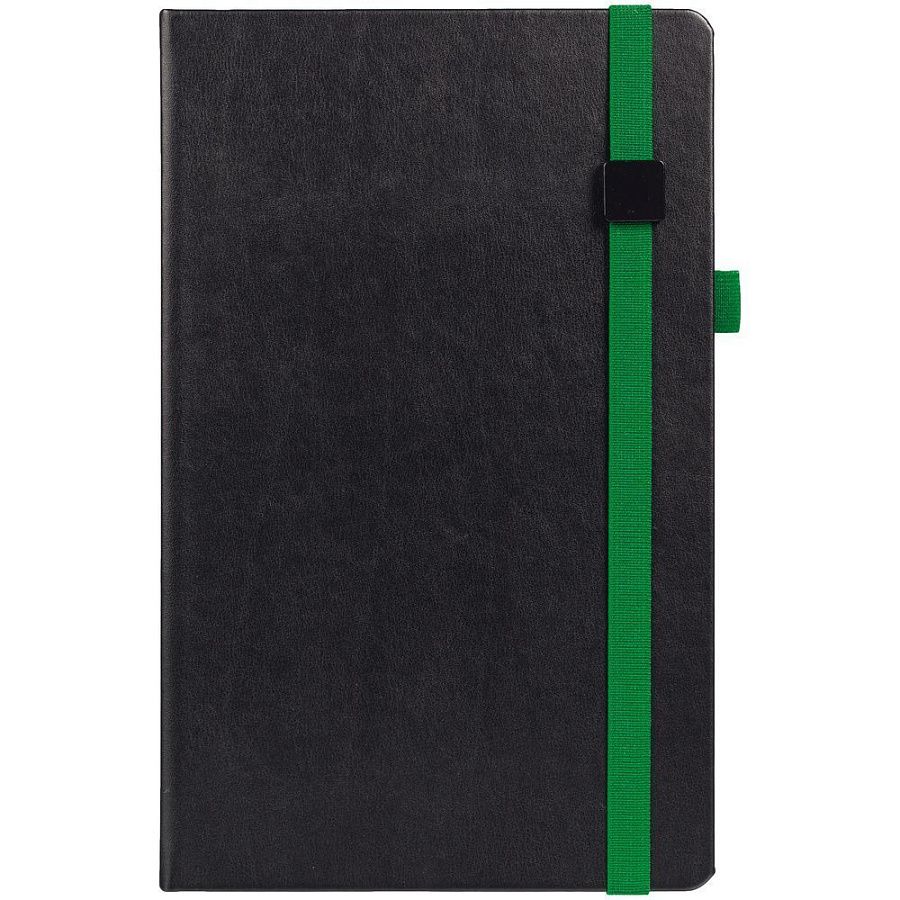 Ежедневник с твердой обложкой, выполнен из материала Waltz, черный АА, дополнен зеленой резинкой с металлическим шильдом и ляссе.