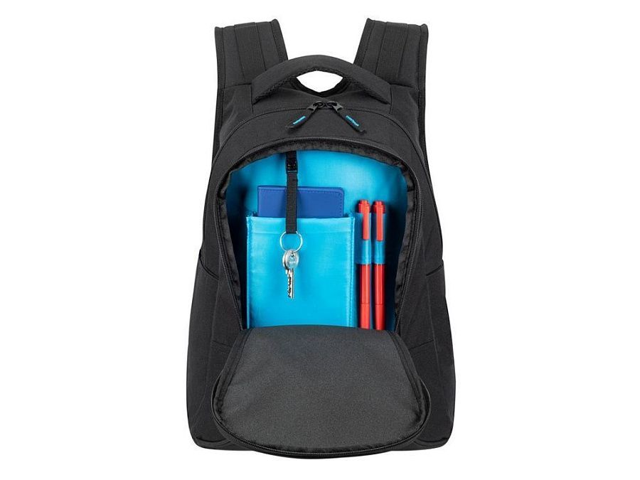 • Передний карман на молнии оборудован панелью-органайзером для хранения авторучек, аксессуаров, а также съёмным карабином для ключей.