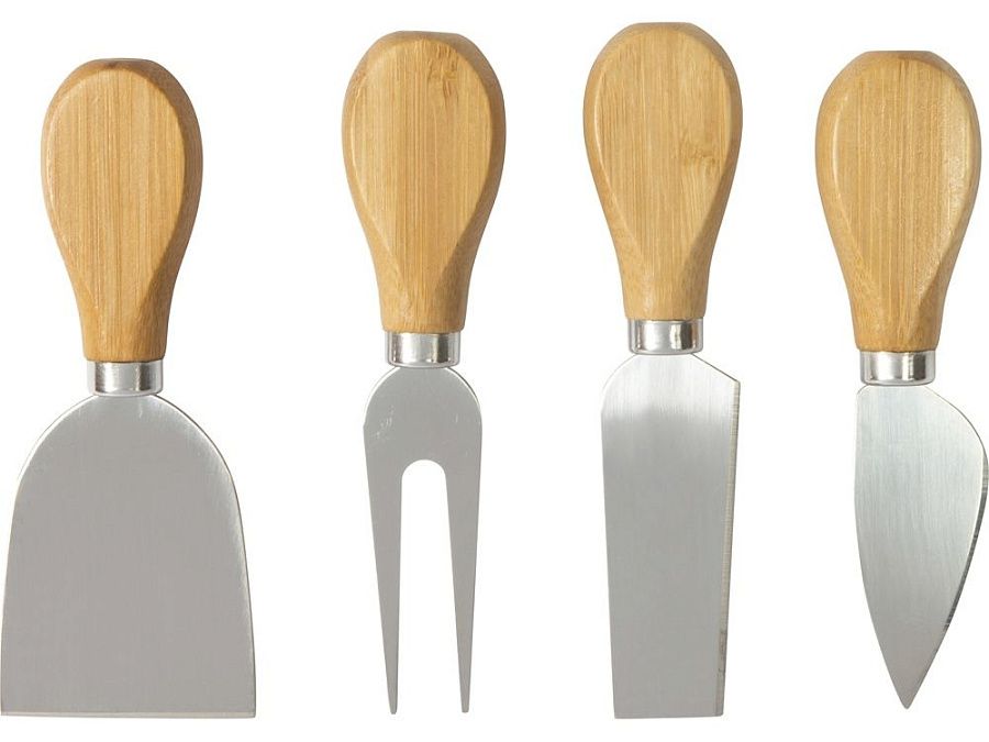 Листовидный нож или, как его еще называют, нож для пармезана, предназначен для твердых сортов сыра, которые практически невозможно порезать, скорее их нужно колоть. Нож-стамеска предназначен для очень мягких сыров, а широкая лопатка — для мягких и полутвердых. Двузубая вилка используется для сервировки, а также помогает при нарезании.