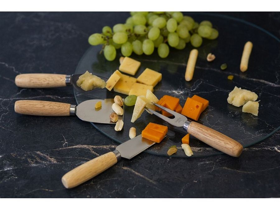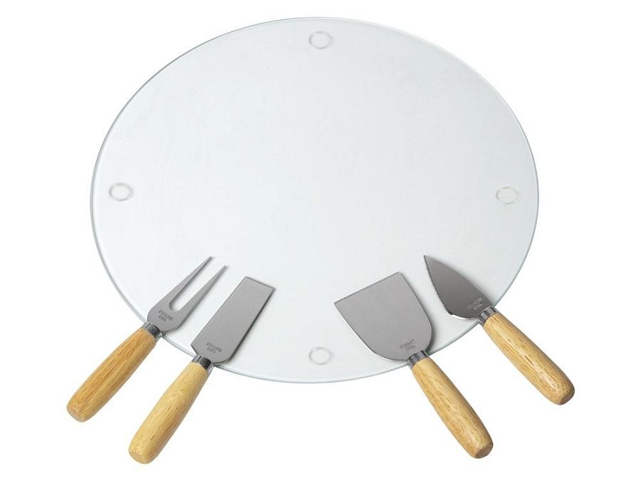 стеклянная доска 30 x 0,4 см, нож для твердого сыра 13,5 см, нож для мягкого сыра 14,2 см, вилка для сыра 14 см, нож для пармезана 13,8
