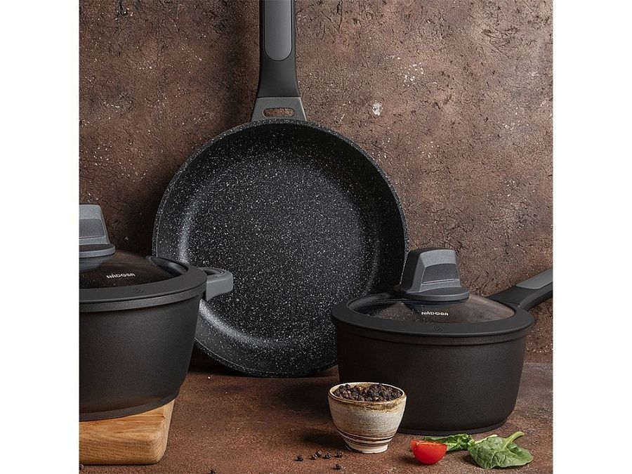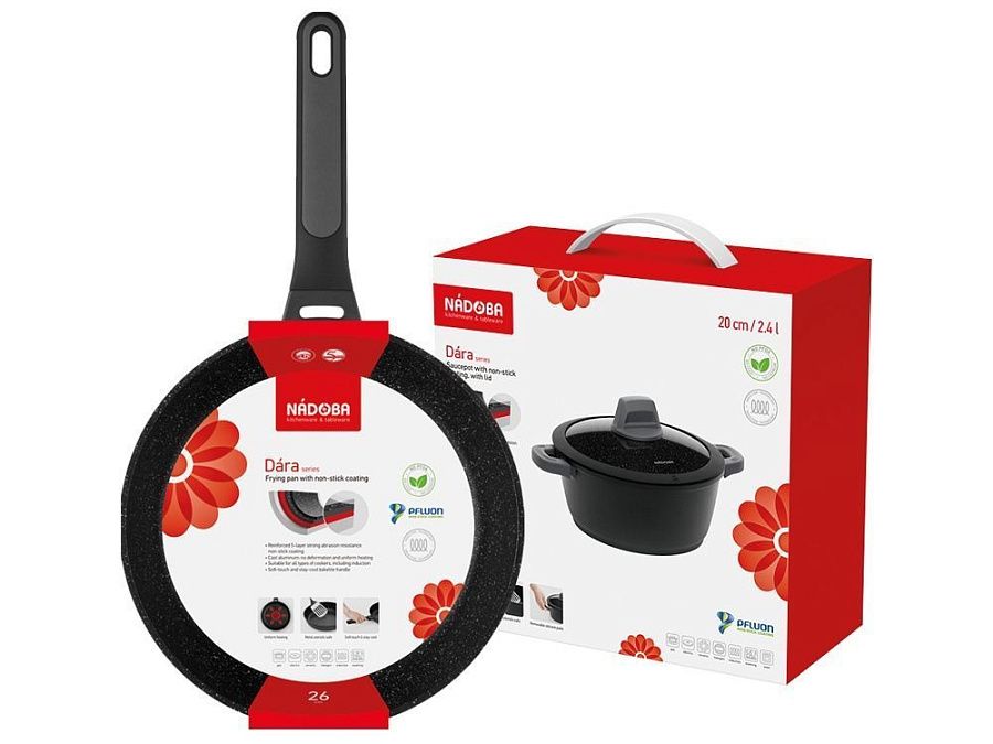 Продукция серии Dara изготовлена из литого алюминия с использованием особо прочного 5-слойного антипригарного покрытия Pfluon, обладающего прекрасными антипригарными свойствами, прочностью и износостойкостью, благодаря чему посуда подходит для ежедневного использования и будет служить не один год. В серию NADOBA Dara входят сковороды 20, 24, 26, 28 см, глубокая, блинная, кастрюля, ковш и сотейник.