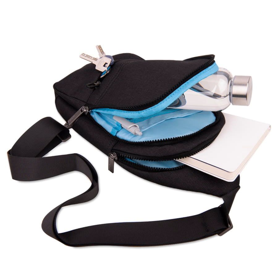 Два больших основных глубоких отделения с мелкими отделениями для мелочейКарман с RFID-защитой на молнии со стороны спинки для размещения самых ценных предметовНебольшой внешний карман на лицевой стороне на молнии со стильнымпластиково-металическим пуллеромКачественная регулируемая лямка с карабином и двумя кольцами внизу спинки
