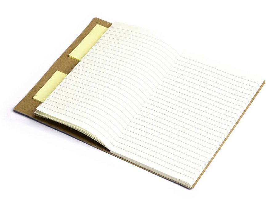 Набор включает в себя разноцветные стикеры разных размеров, блокнот с линованной бумагой и ручку c корпусом из переработанного картона. Обложка выполнена из фактурной искусственной кожи, которая, при тиснении, меняет цвет на более глубокий.