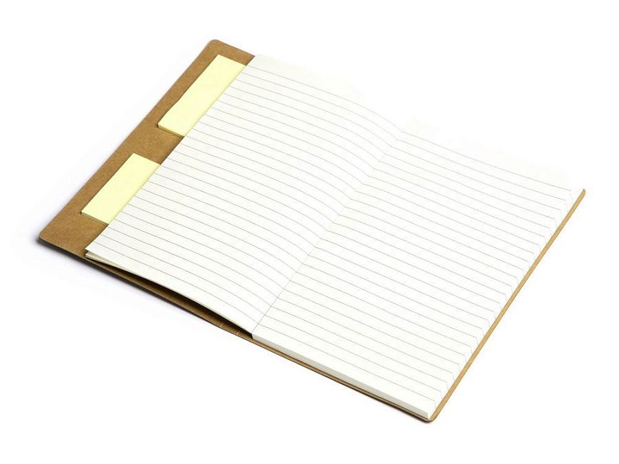 Набор включает в себя разноцветные стикеры разных размеров, блокнот с линованной бумагой и ручку c корпусом из переработанного картона. Обложка выполнена из фактурной искусственной кожи, которая, при тиснении, меняет цвет на более глубокий.