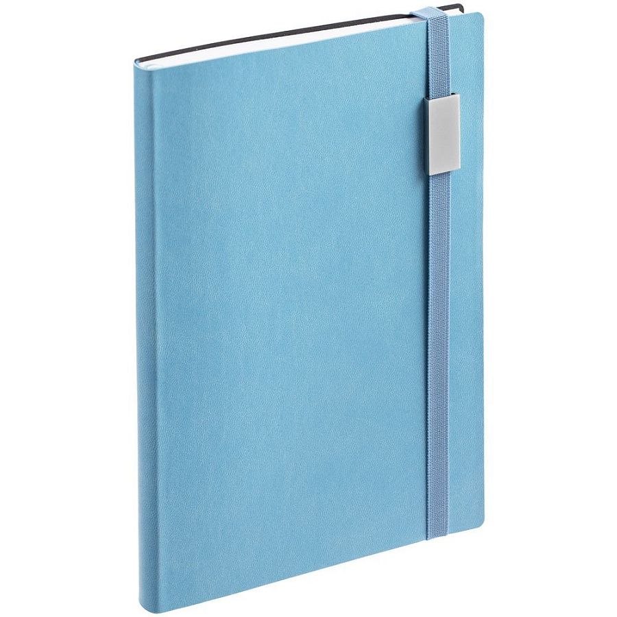 Ежедневник с гибкой обложкой, выполнен из материала Latte, голубой JJ, дополнен резинкой шириной 1 см с металлическим шильдом, капталом и ляссе голубого цвета.