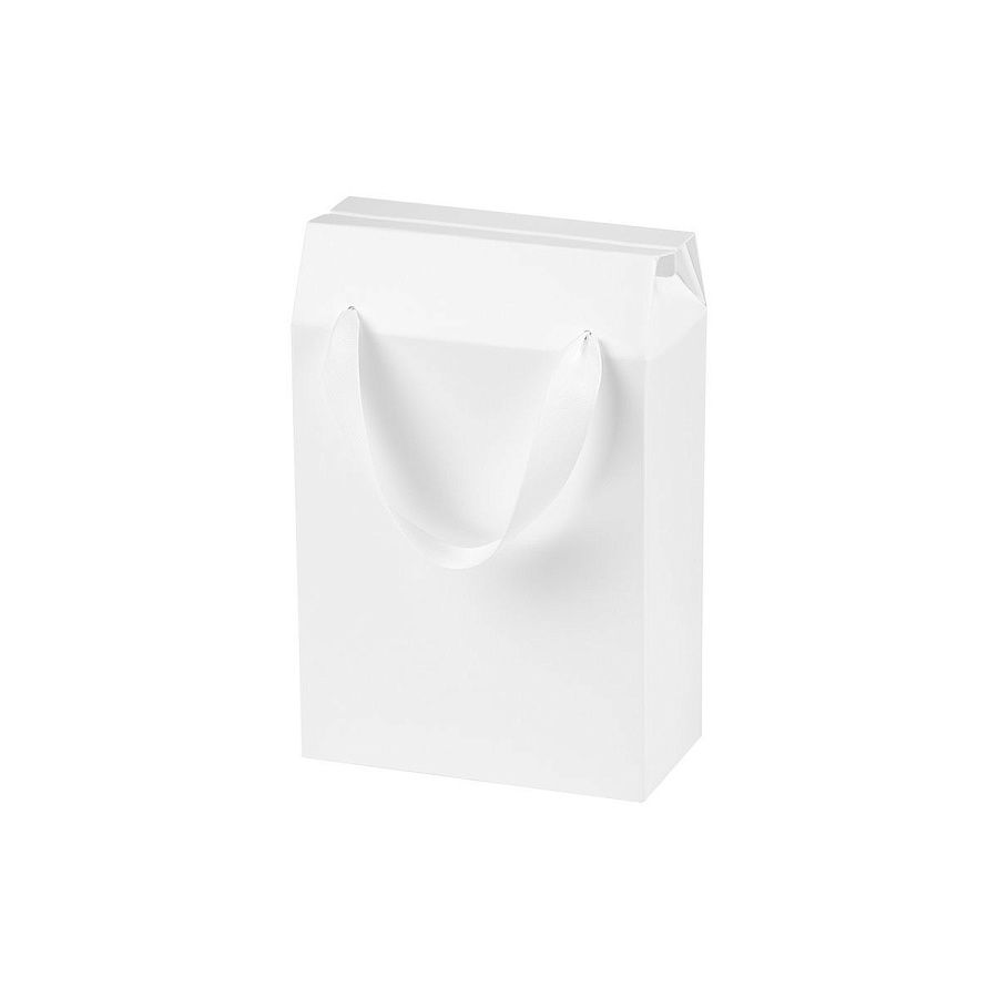 Универсальный пакет – коробка небольшого размера, тем не менее, вмещает различные вариации подарочных наборов. Выполнен в праздничном белом цвете с ручками из репсовой ленты. Станет хорошей упаковкой для подарочного набора.