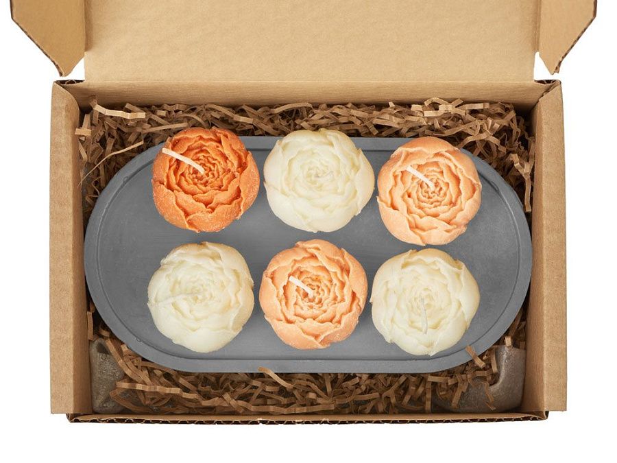три белых свечи пион, одна темно-персиковая свеча пион, две персиковые свечи пион, подставка гипсобетон, упаковочный материал