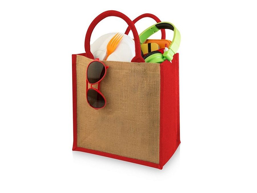 Джутовая подарочная сумка с ламинированным открытым основным отделением, которое застегивается на липучку. Хлопковые ручки высотой 11,5 см.