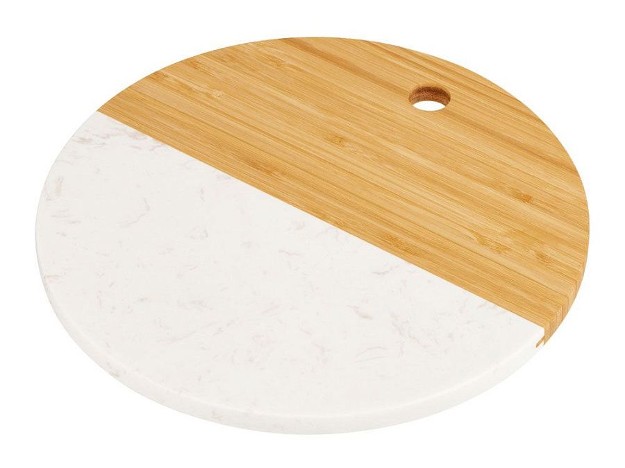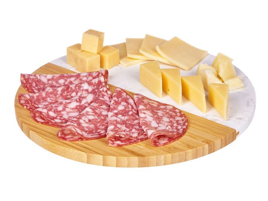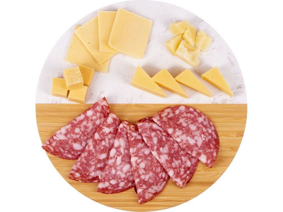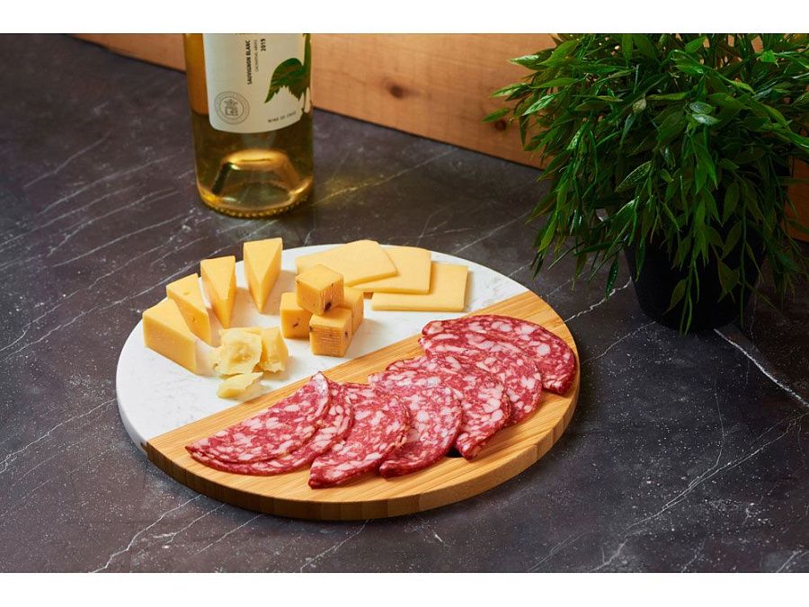 Разделочная доска от Eat&Bite состоит наполовину из бамбука, а вторая половина выполнена из мрамора. Это позволяет не только использовать доску для разделки, но и оригинально подать закуски, сыры или нарезки, зонируя виды снеков.