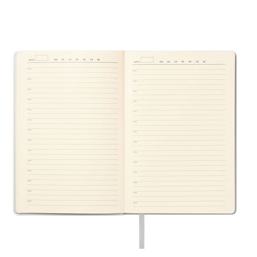 Гибкая обложка из высококачественной искусственной кожи с текстурированной поверхностью и легким полуглянцевым блеском притягивает взгляд. Скругленные углы обложки и внутреннего блока добавляют ежедневнику изысканности.