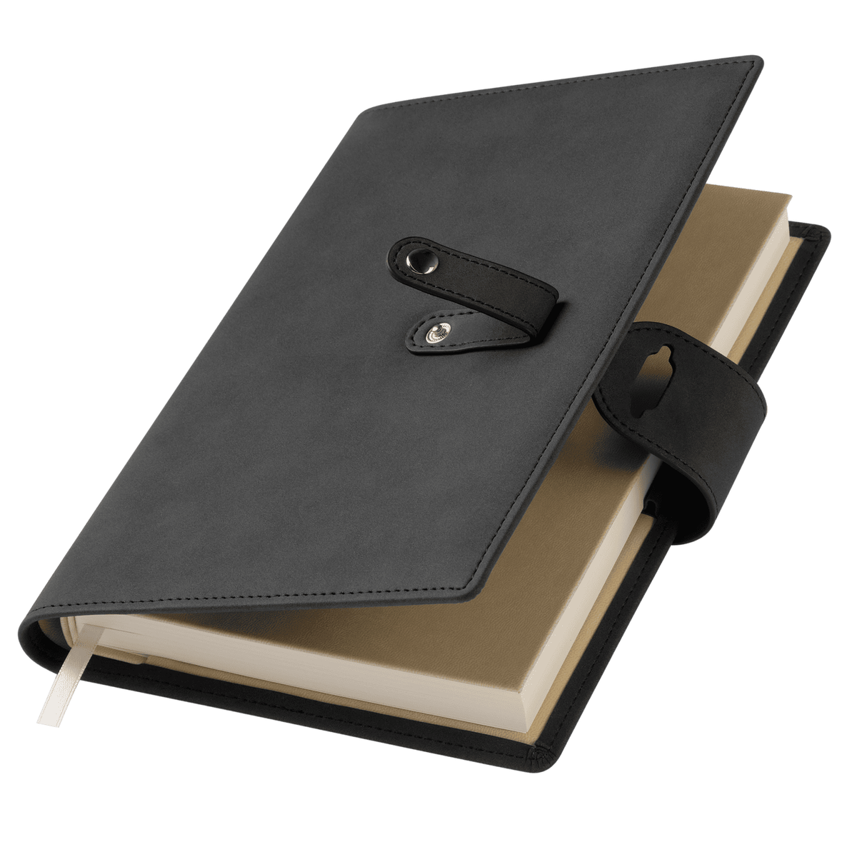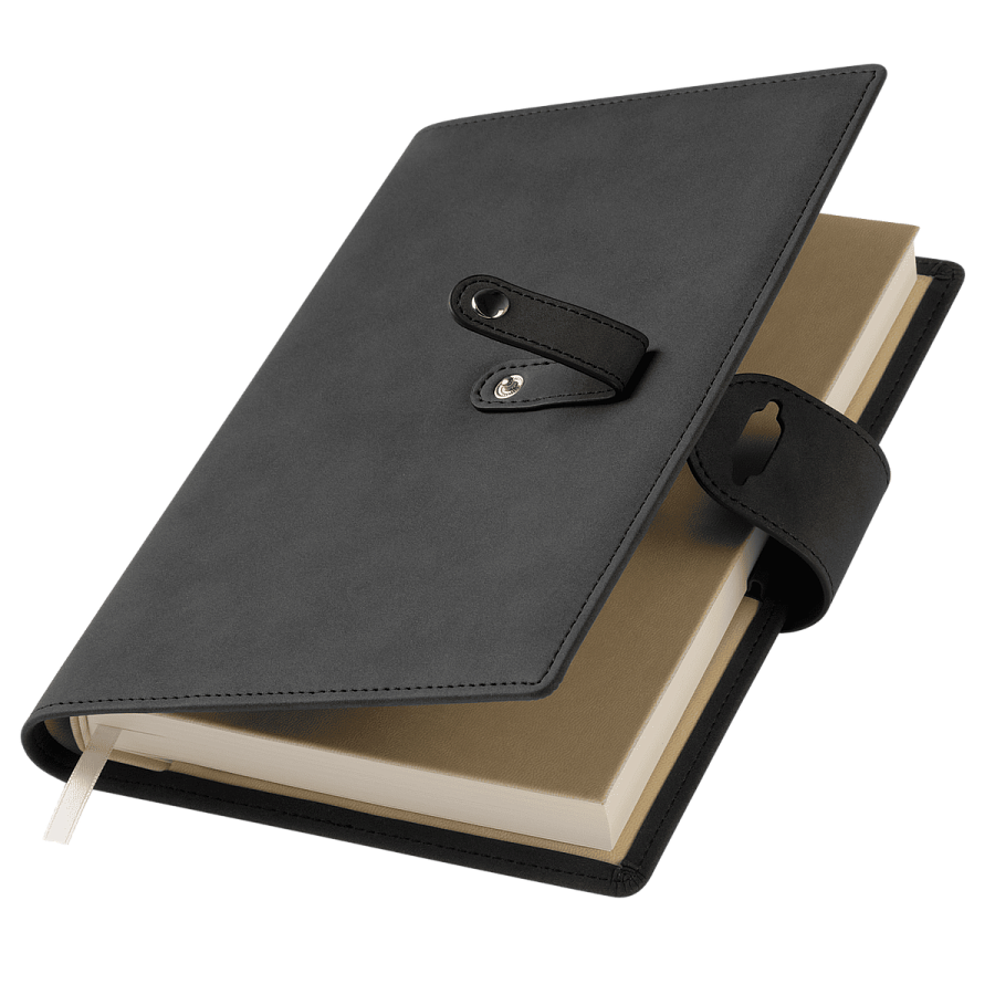 Застежка двойная – состоит из ремешка с металлической кнопкой и декоративной петли из материала обложки