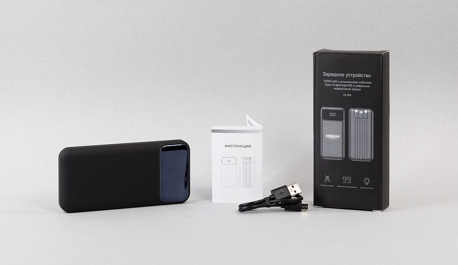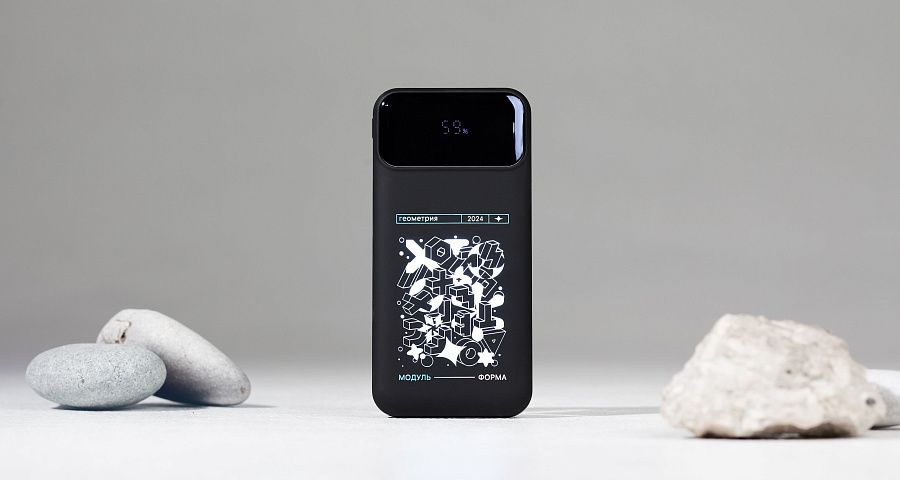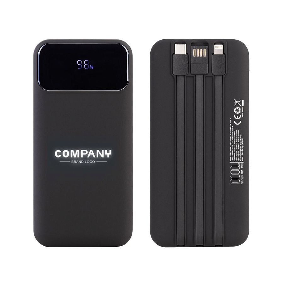 Быстрый зарядник с полезными удобными дополнительными опциями - встроенными кабелями и цифровой индикацией уровня оставшегося заряда в %. Супербонус - яркая персонализация в виде подсветки логотипа.