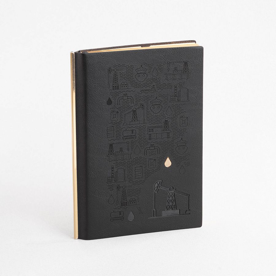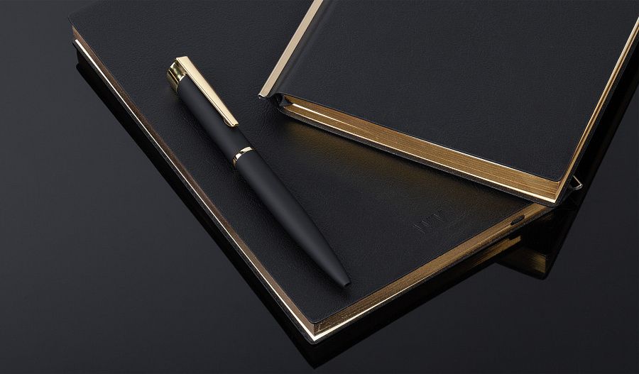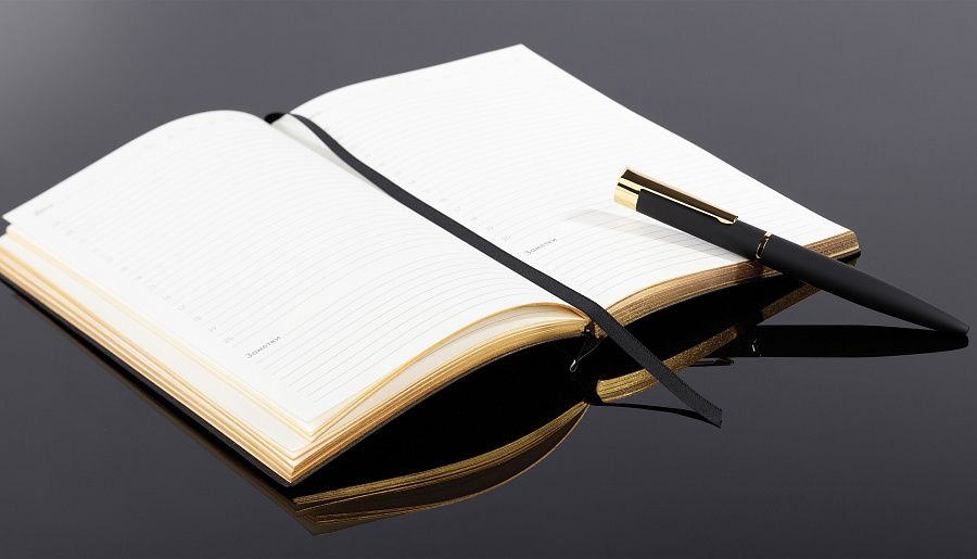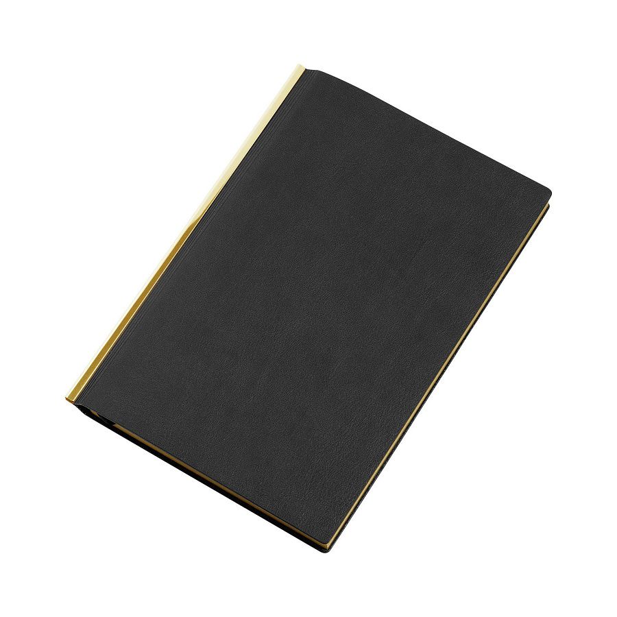 Сочетание черной гибкой фактурной обложки, золотистой металлической планки и золотого среза смотрится в меру дорого. Блок из плотной тонированной бумаги в 256 страниц представляет достаточно места для записей.