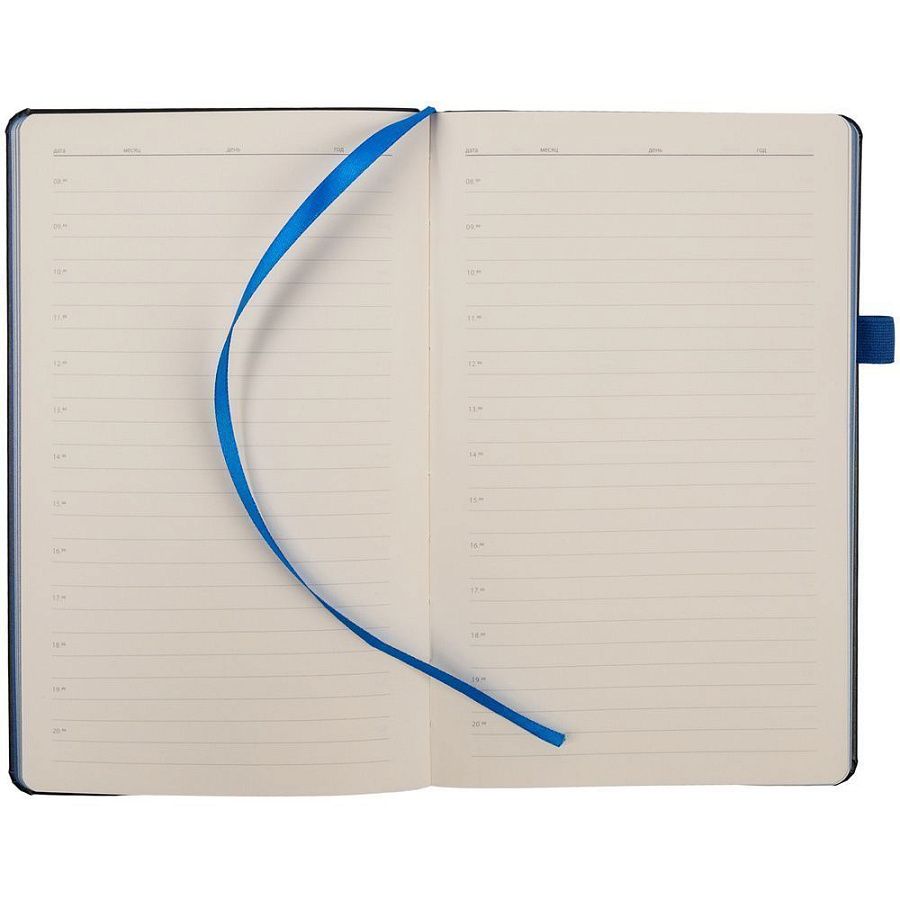 Ежедневник с твердой обложкой, выполнен из материала Waltz, черный АА, дополнен оранжевой резинкой и ляссе.