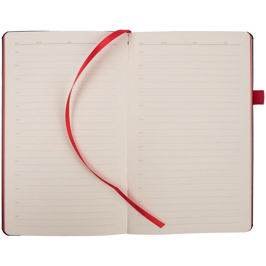 Ежедневник с твердой обложкой, выполнен из материала Waltz, черный АА, дополнен красными резинкой и ляссе.