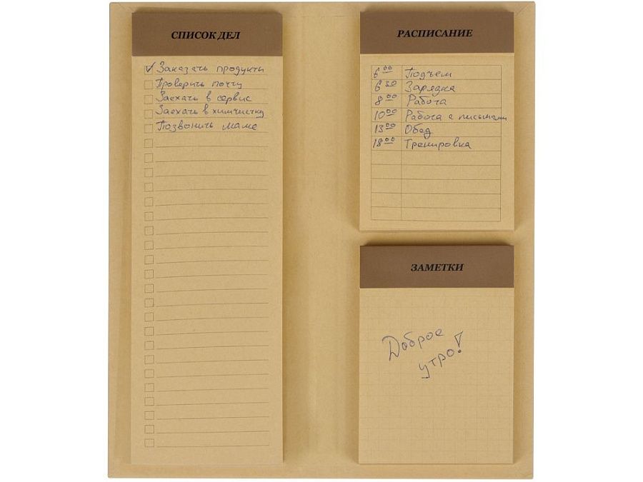 Все листы отрывные с микроперфорацией, что позволяет их легко менять. В каждом из 3-х блоков по 60 листов, каждый из которых имеет свою линовку и подписан: «Список дел», «Расписание» и «Заметки».