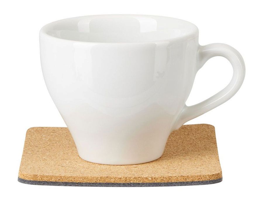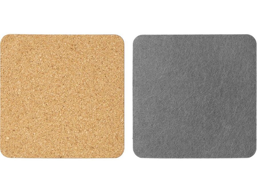 Четыре квадратных костера, выполненных из фетра и пробки. Благодаря выбору материалов «посадка» стаканов — мягкая и бесшумная: и пробка, и фетр заглушают звук, безопасны и для посуды, и для поверхности стола, защищая от механических повреждений и загрязнения.