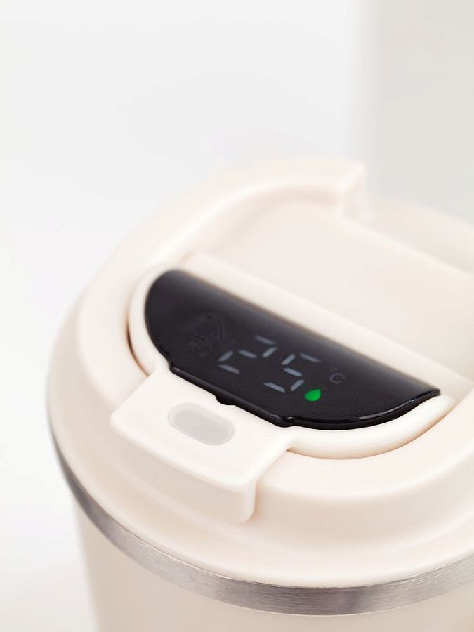 Умный термостакан tellMug показывает температуру напитка на сенсорном ЖК-дисплее — точные данные собирает встроенный в крышку датчик.