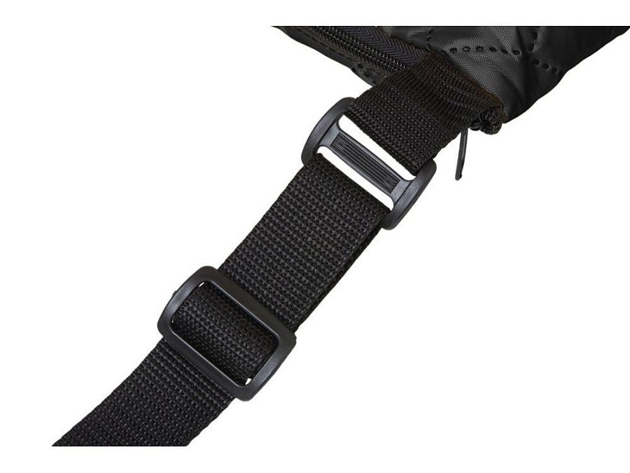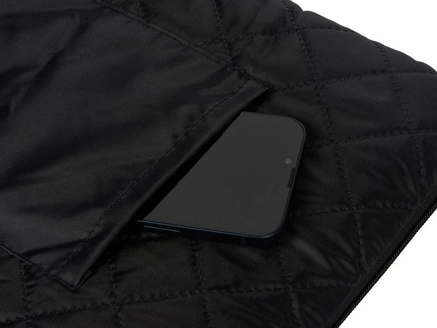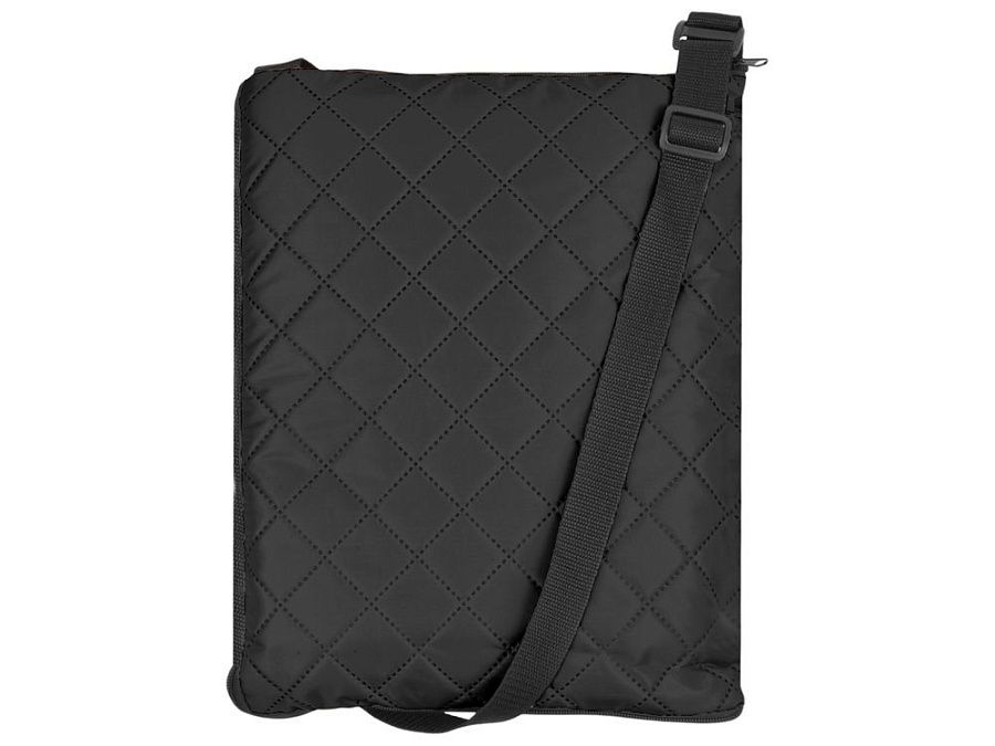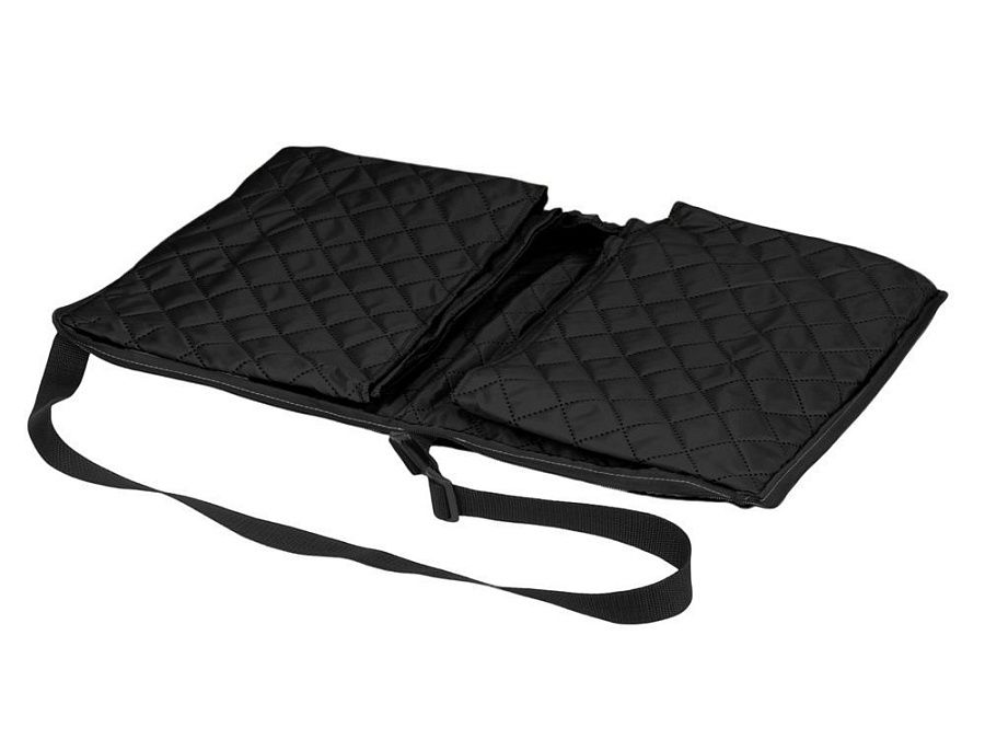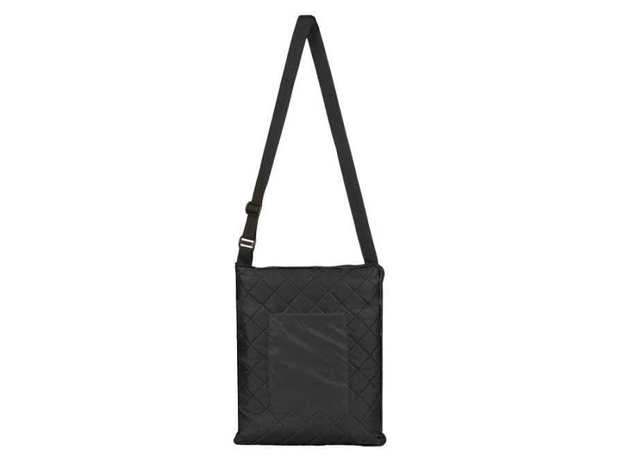 Двухсторонний плед с водоотталкивающим покрытием с одной стороны и мягким флисом с другой. Складывается в сумку на плечо и фиксируется с помощью молнии. В собранном виде имеет регулируемый по длине ремень для переноски и наружный карман для мелочей.