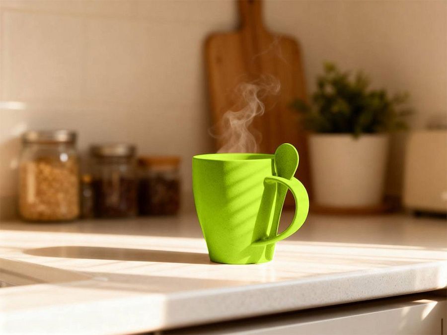 Кружка «Nina» состоит из смеси ПП-пластика (50%) и переработанной пшеницы (50%), что делает ее настоящим экомерчем. Поверхность кружки имеет приятный бежевый оттенок с небольшими вкраплениями-точками темно-серого цвета, которые только подчеркивают природное происхождение «Nina».