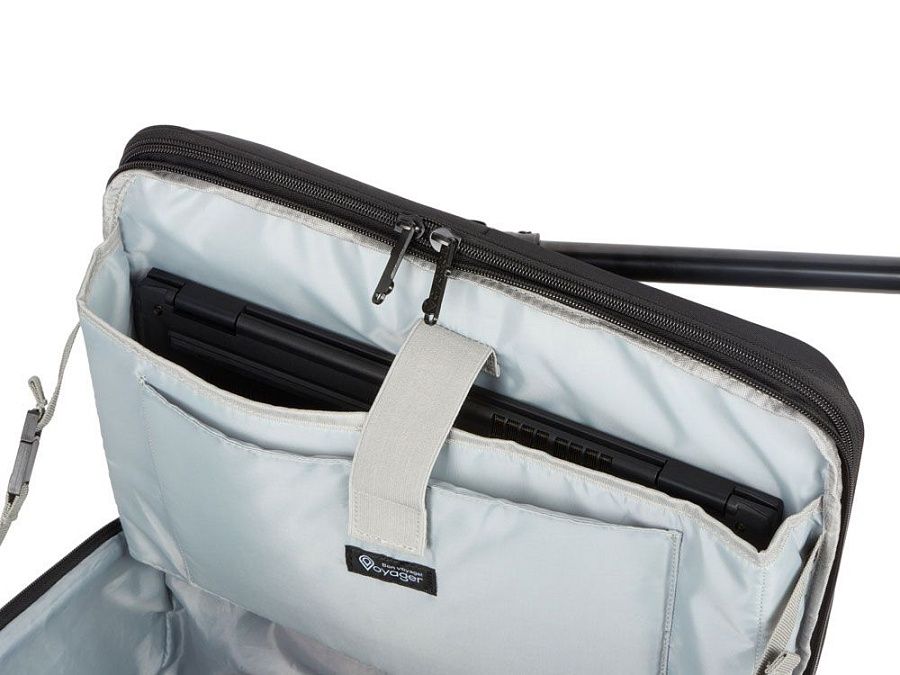 - большое отделение с карманами для ноутбука и планшета и пространством для одежды с фиксатором-пряжкой