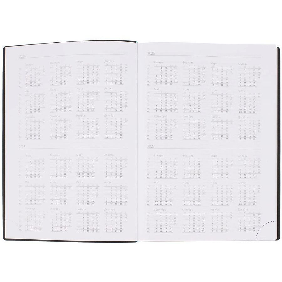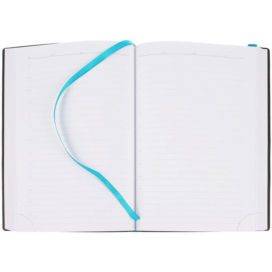 Ежедневник с гибкой обложкой выполнен из материала Latte, морская волна II, и дополнен резинкой шириной 1 см, капталом и ляссе в цвет обложки.