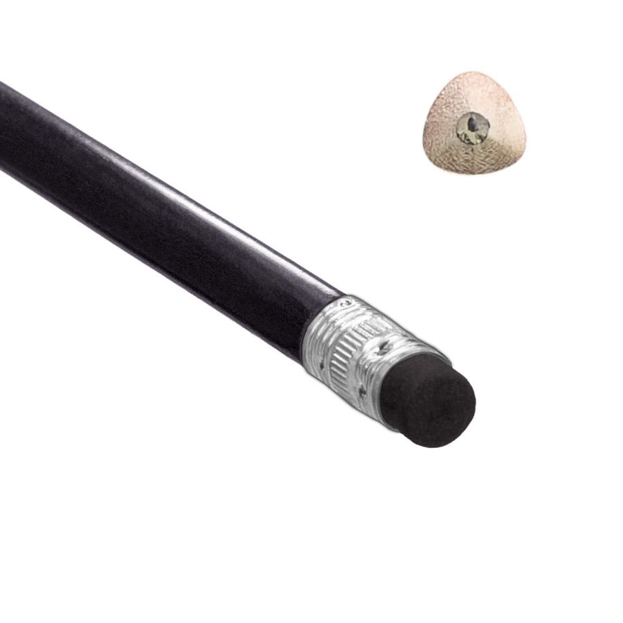 Деревянный карандаш треугольной формы с ластиком в цвет самого карандаша.