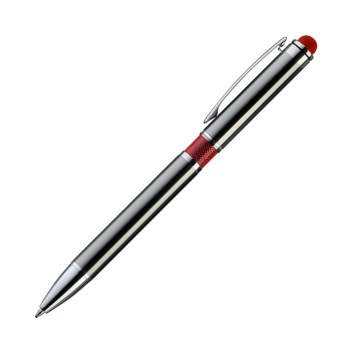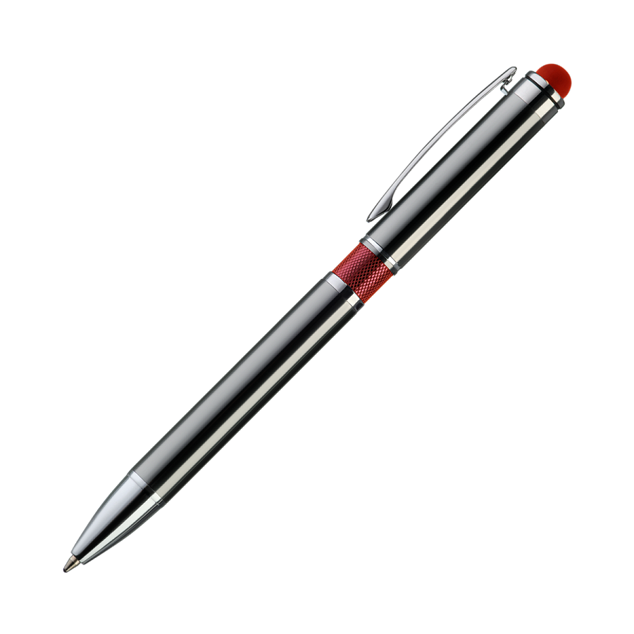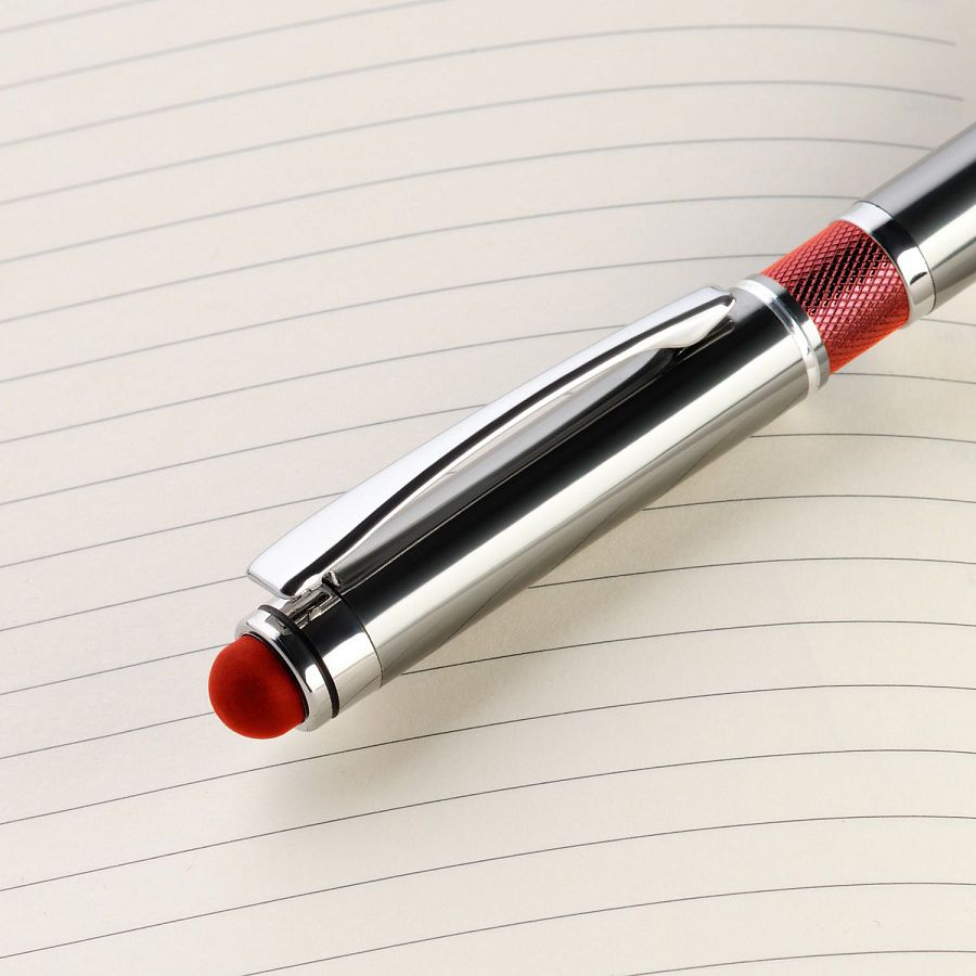 Классическая ручка цвета металлик с цветными деталями. Оснащена стилусом для работы с сенсорными экранами.