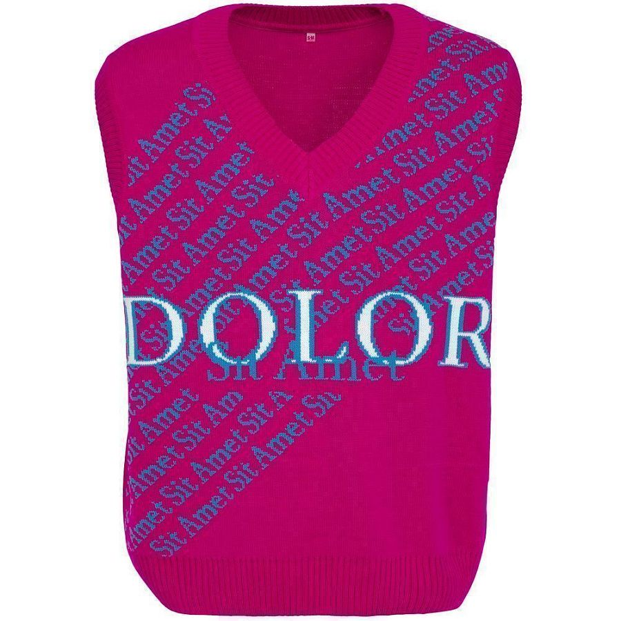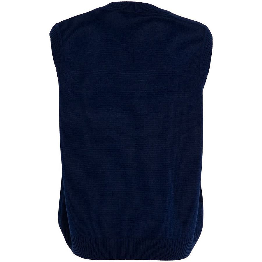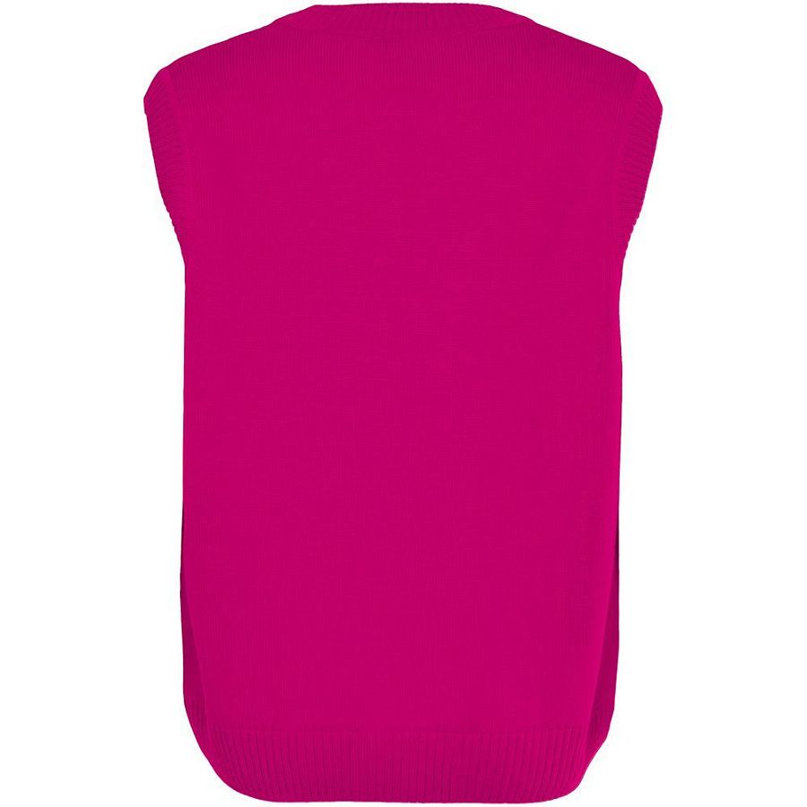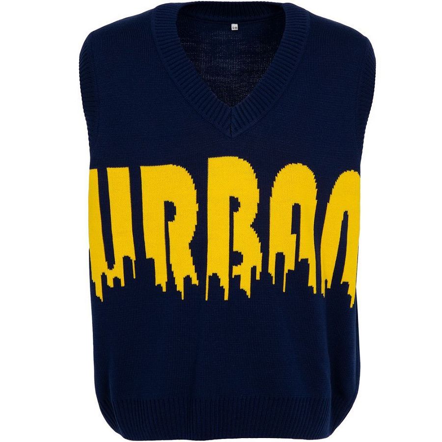 Жилет оверсайз с вывязанным логотипом и индивидуальным рисунком в фирменной цветовой гамме.