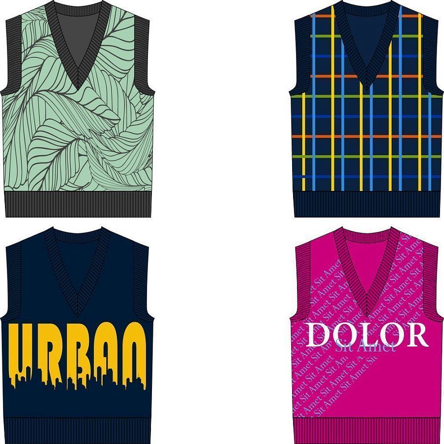 – на однотонных пространствах можно «разделить» полотно (кажется, что жилет двуслойный), поэтому рекомендуется не оставлять больших однотонных площадей.