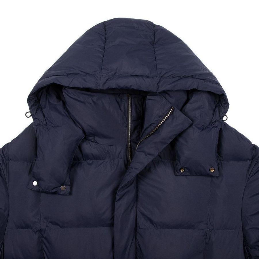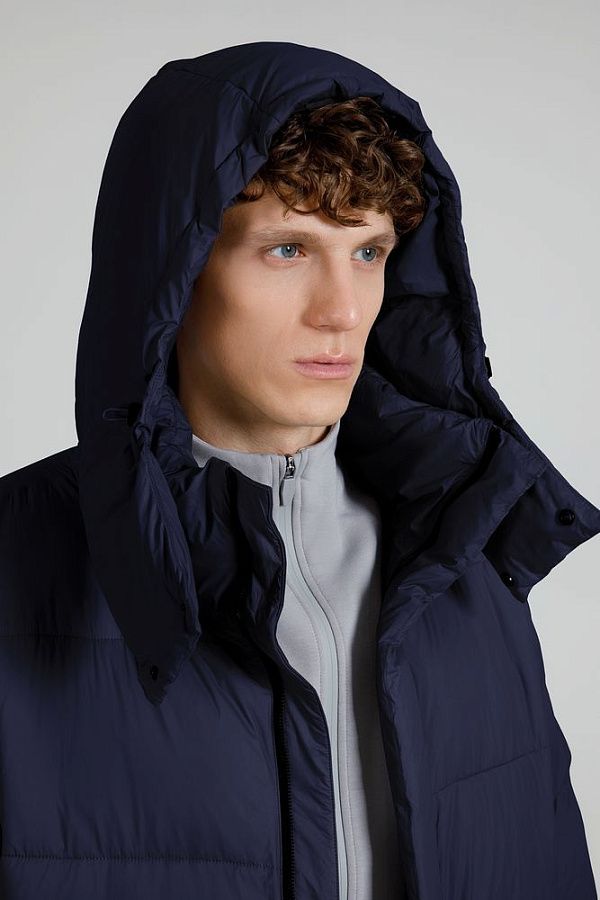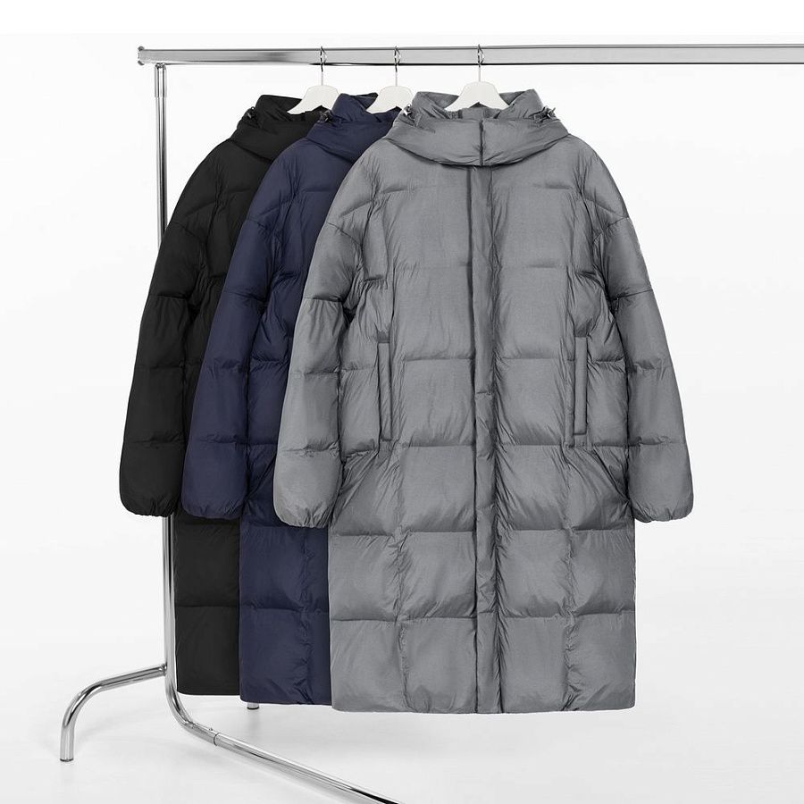 Удлиненный пуховик унисекс с капюшоном.