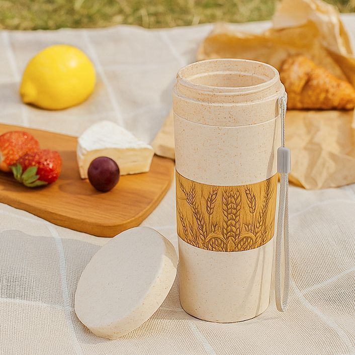 Удобный, компактный термостакан для горячих напитков. Крышка прилегает плотно и удерживает от случайных протечек. Пшеничное волокно — отличный экологичный материал, позволяет подогревать в микроволновой печи. Однако не стоит лить крутой кипяток или кипятить в нём воду, поскольку при температуре выше 80°C термостакан может терять некоторые свойства. Петелька позволит удержать стакан, если тот выскользнет с рук. Двойная стенка удерживает тепло и не даёт обжечься. Горячо во рту, а не в руках!