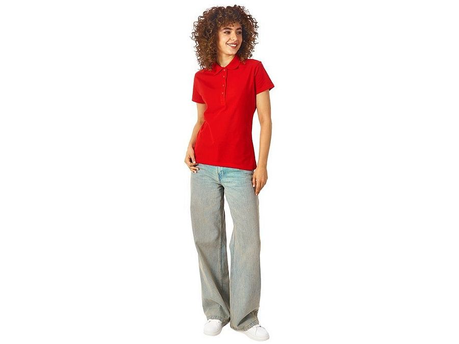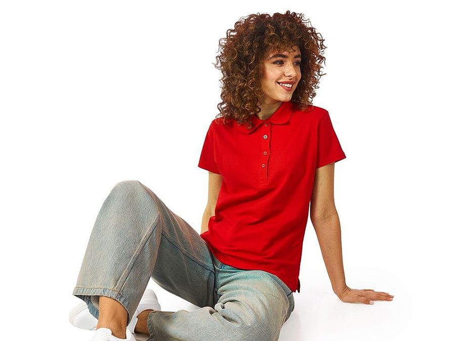 Женская рубашка-поло First. Воротник 1х1. Обшивка внутри воротника. Мужская и детская модели с 2 пуговицами, женская - с 4 пуговицами. Пуговицы с гравировкой в тон. Пике, 100% хлопок. 160 г/м2.