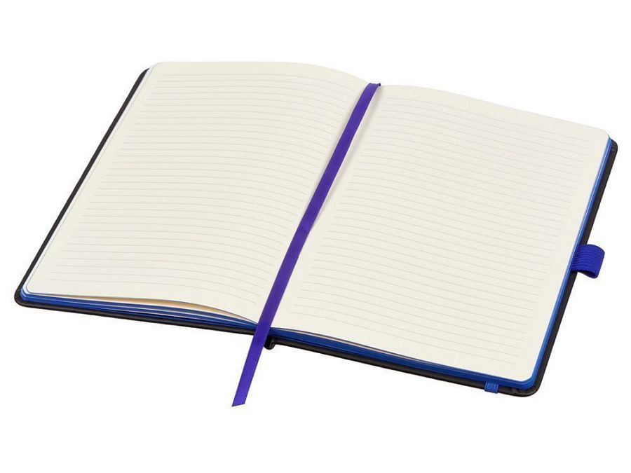 Блокнот в твердой обложке с закругленными углами черного цвета. Ляссе, резинка и срез яркого контрастного цвета делают его очень стильным и функциональным бизнес-аксессуаром.